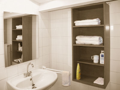 In de badkamer zijn een wc, een wastafel met warm en koud water en een douchecel -